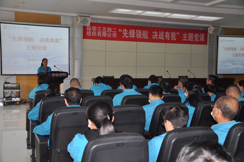 10月10日,际华三五四二纺织有限公司利用周末大讲堂,举办“先锋领航 决战有我”主题党课,公司党委书记张慧霞、中级职称以上干部及党工团相关人员参加主题党课。