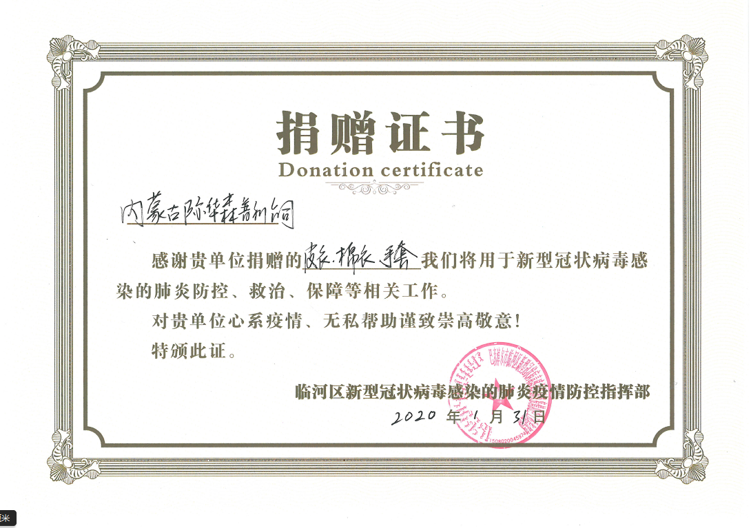 近日,际华森普利公司获得巴彦淖尔市临河区疫情防控指挥部捐赠证书,肯定了我公司的责任担当和爱心之举。