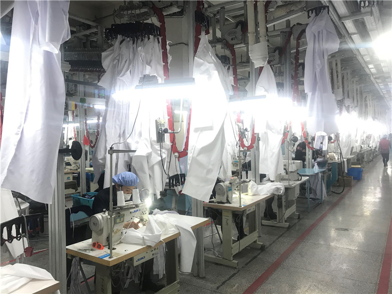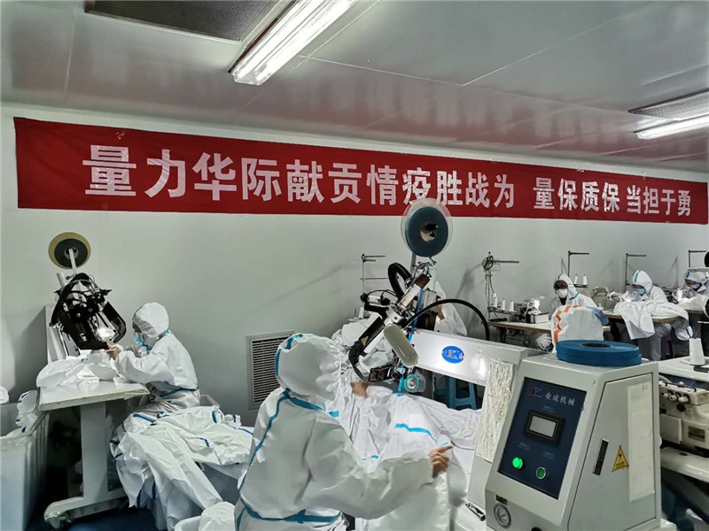 “评价一批生产的防护服合不合格,有两个关键性技术指标:一个是防护服的屏蔽性。我们会按规范抽检成品,也会随机拿来员工的半成品,采用GB/T4744-1997《纺织织物抗渗水性测定静水压测定》标准来进行水压试验,以拒水性来间接表示防止细菌穿透防护服的能力。还有一个是血液穿透性能。模拟防护服被穿孔血管血液喷溅的场景,看生产的防护服具不具备良好的血液阻隔性能,不得渗漏。”际华7555公司技术质量部部长王瑜一边说道,一边忙而不乱地做防护服水压检测试验。 在当前疫情防控形势严峻的情况下,据了解,际华7555公司积极转产扩产,在自治区领导的高位推动下,3天时间,在新疆乌鲁木齐市特丰药业公司建成开工了一条日产量2500套的一次性医用防护服生产线,在规定时间内完成自治区新冠肺炎疫情防控指挥部下达的紧急生产任务。满负荷生产第一枪打响后,为了做到防疫生产两不误,公司建立了科学有序的疫情防控体系,从员工返程、防疫、就餐、生产、隔离、住宿等做出细致安排。参加医用防护服复工生产的100余名“突击队”员工统一戴口罩工作,每天上岗之前都会接受两次以上体温测量和手腕酒精消毒,生产车间、办公室和住宿区域每天不低于两次全覆盖消毒,同时采取分时段供餐、打包带走等方式,减少人员聚集,通过多举措密切追踪员工假期行程,了解员工健康状况,确保了整个复工生产和防疫工作两不误。 与此同时,位于昌吉市公司本部、南疆和静县分公司的各个生产车间也是一派繁忙,员工们正紧张有序地赶制外围防护工作服和一次性隔离服,最大限度扩产能、提产量、保质量,为打赢抗疫防控阻击战交出“亮眼”答卷。