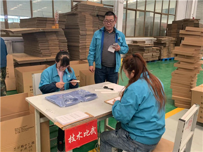 俗话说“台上十分钟,台下十年功”。比赛开始后,参赛选手们井然有序的按照小组分工合作,有选取衬衣的,有贴号型的,有装箱的,很自然的就形成了四道包装流水线,就如赛场上的四个跑道一样,选手们都竭尽所能的把自己手里的“接力棒”交给下一位队友。旁边观战的同事们也都忍不住的喊“加油!加油啊!”虽然已是严寒的冬季,但是此刻六车间的工房内弥漫着暖暖的温度,因为此刻他们的心是滚烫的。在近十五分钟的赛程中,选手们听到大家的鼓劲加油更是争分夺秒,一个个的都拿出了自己的看家本事,熟练地操作,默契的配合,把自身技能和团队协作精神发挥到了极致。