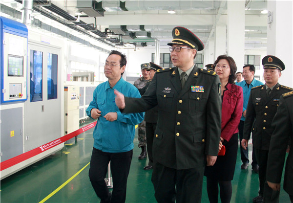 陈兆明一行参观了强人工业园,并深入德士马智能生产线、智能胶粘生产线实地参观考察。范子坤向陈兆明一行详细介绍了公司近年来在推进军民融合、智能制造、阅兵保障等方面取得的成绩。
