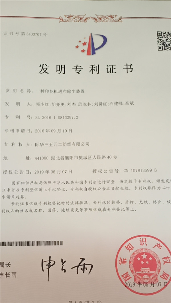 《一种印花机进布除尘装置》是该公司印染事业部立设计、制作和安装的一种能有效去除印花坯布表面附着力强的布绒毛的装置,减少生产过程中因布绒(灰尘)易沾污印花圆网出现白点状的斑疵,从而提高印花布产品质量。